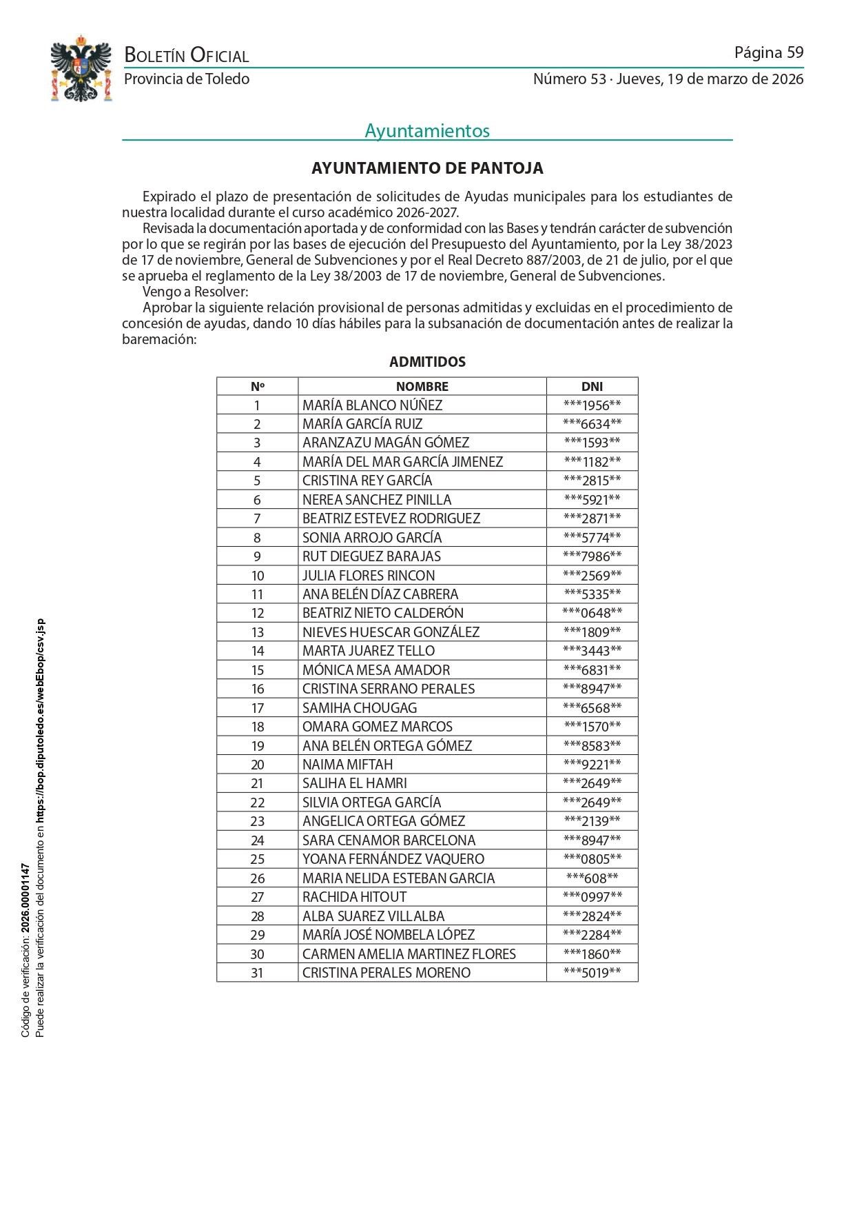 Publicado en el BOP Toledo la la relación de personas admitidas y excluidas en el procedimiento de ayudas. Consulta el listado: https://bop.diputoledo.es/webEbop/ebopResumen.jsp?publication_date=19/03/2026&publication_date_to=19/03/2026