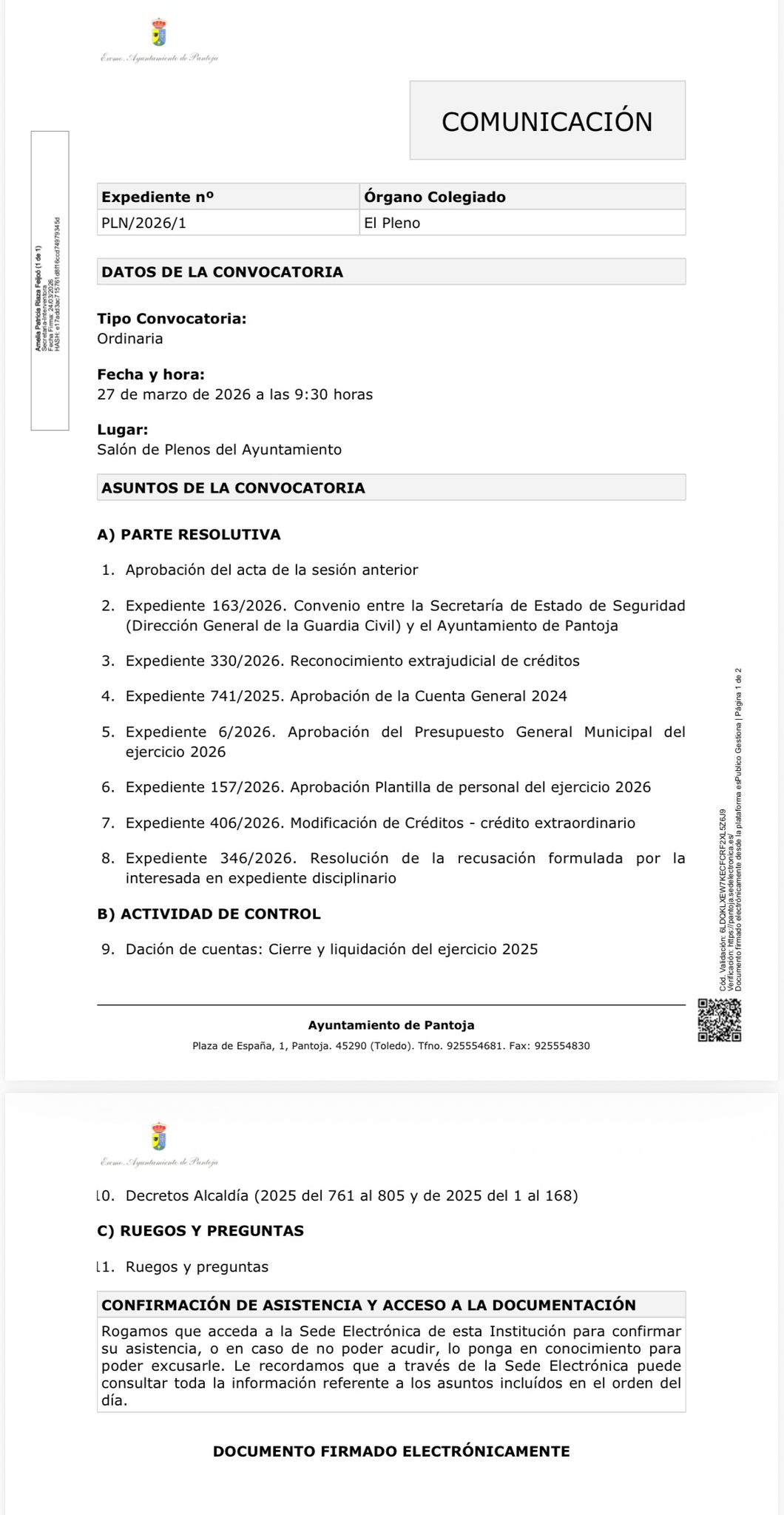 27 de Marzo de 2026 09:30H. Salón de Plenos del Ayuntamiento de Pantoja https://pantoja.sedelectronica.es/preview-document/34b34702-a858-4e1f-baf2-c9d3cf5f1013/
